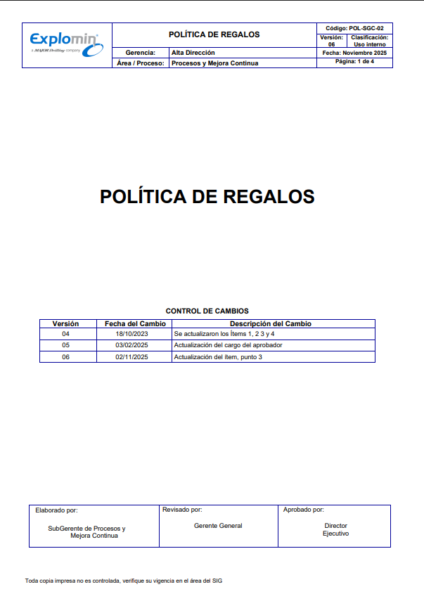 EXPLOMIN es una compañía íntegra, justa y orientada a la excelencia en todos los ámbitos, cumpliendo con las regulaciones legales y específicas de la empresa, además de la adhesión a los más altos estándares éticos y de conducta profesional. Entendemos que la reputación es uno de los principales activos de la empresa, que nos permitirá asegurar la sostenibilidad del negocio en el tiempo. Asimismo, somos conscientes que la reputación de EXPLOMIN está constituida y sostenida por la conducta de cada uno de sus colaboradores y en el desarrollo de nuestras actividades en un marco de honestidad e integridad, formando parte de nuestra cultura como organización, de nuestros objetivos estratégicos a largo plazo y en compromiso con un buen gobierno corporativo.